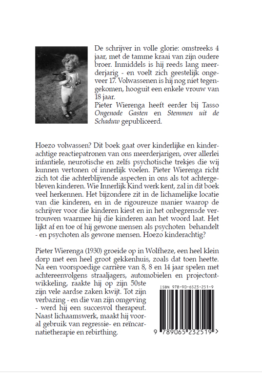 Hoezo volwassen? Dit boek gaat over kinderlijke en kinderachtige reactiepatronen van ons, meerderjarigen, over allerlei infantiele, neurotische en zelfs psychotische trekjes die wij kunnen vertonen of innerlijk voelen. Regressie- en hypnotherapeut Pieter Wierenga richt zich tot die achterblijvende aspecten in ons als tot achtergebleven kinderen. Wie Innerlijk Kind-werk kent, zal in dit boek veel herkennen. Het bijzondere zit in de lichamelijke locatie van die kinderen, en in de rigoureuze manier waarop de schrijver voor die kinderen kiest en in het onbegrensde vertrouwen waarmee hij die kinderen aan het woord laat. Het lijkt af en toe of hij gewone mensen als psychoten behandelt - en psychoten als gewone mensen. Hoezo kinderachtig?